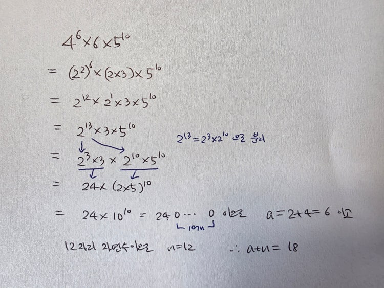 4의 6제곱×6 ×5의 10제곱이 n자리의 자연수이고 각 자리의 숫자의 합이 a일 때 a+n의 값을 구하시오. 라는 문제인데다른건 다 맞는데 갑자기 n이 12가 된다고 나와있어요.아시는분 설명 좀 해주세요ㅠㅠ