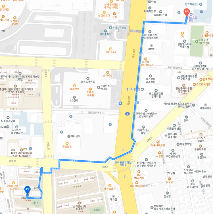 광주서구 화정동 무등파크 광주시 서구 화정동 무등파크에서 서구 죽봉대로 78번길9 에디션 호텔 광천점까지